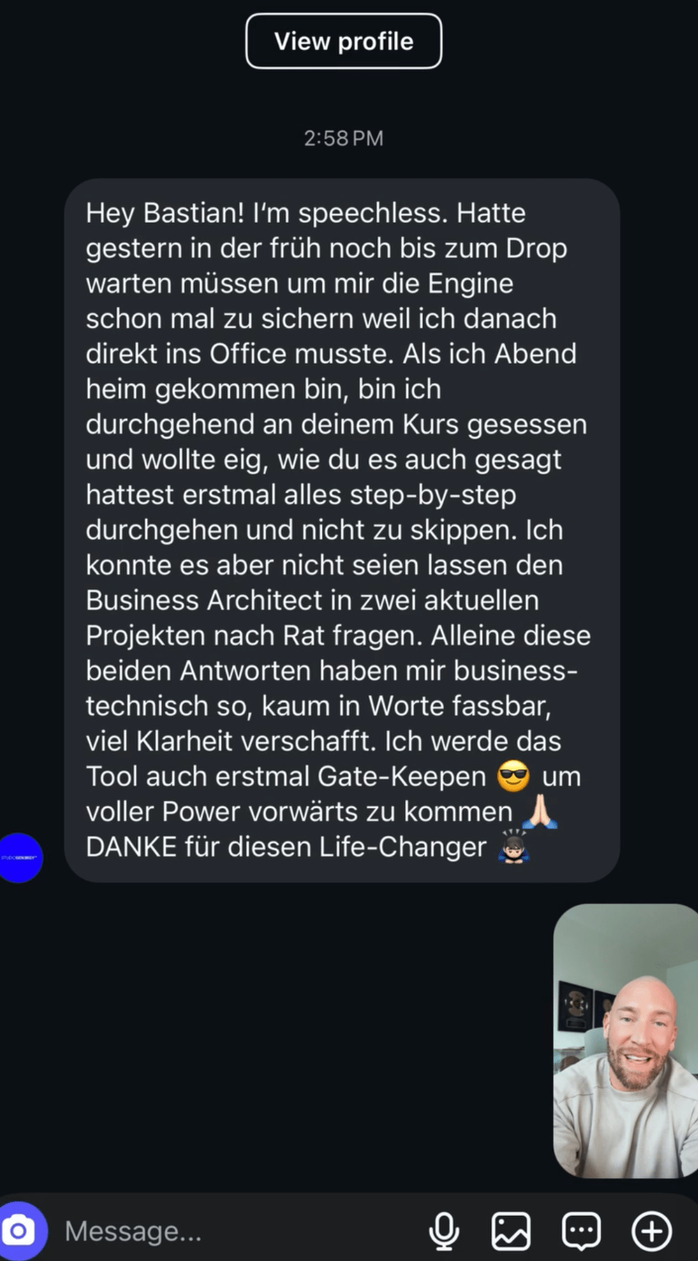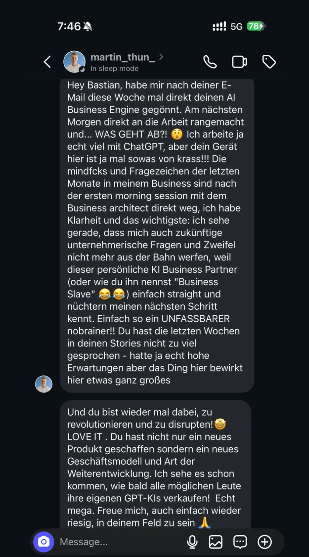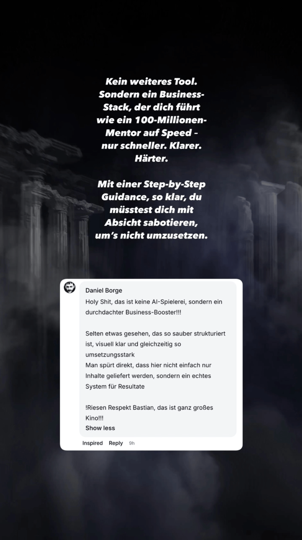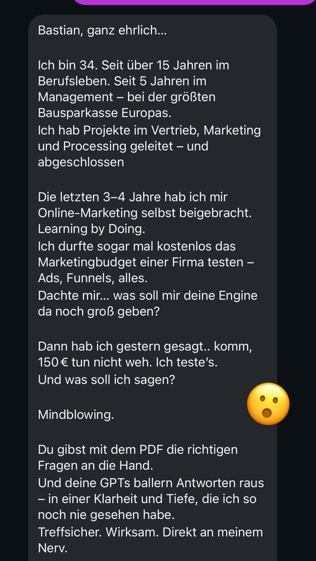 Heute entwickelt er KI-gestützte Tools, die wie ein virtueller Business Coach funktionieren. Und zeigt, wie man Marketing, Copy & Struktur automatisiert – mit Methode, nicht Magie.