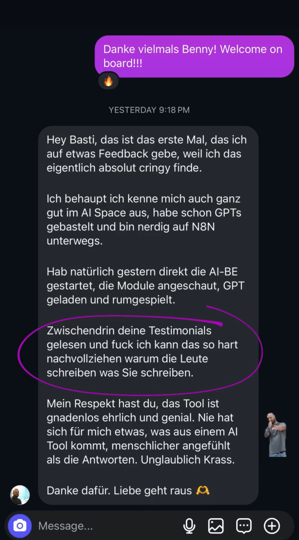 Du musst keine Prompts schreiben oder raten, wie KI funktioniert – du bekommst konkrete Antworten, Schritt-für-Schritt Anleitungen und Umsetzungshilfe, so als würdest du mit einem erfahrenen Unternehmer sprechen.